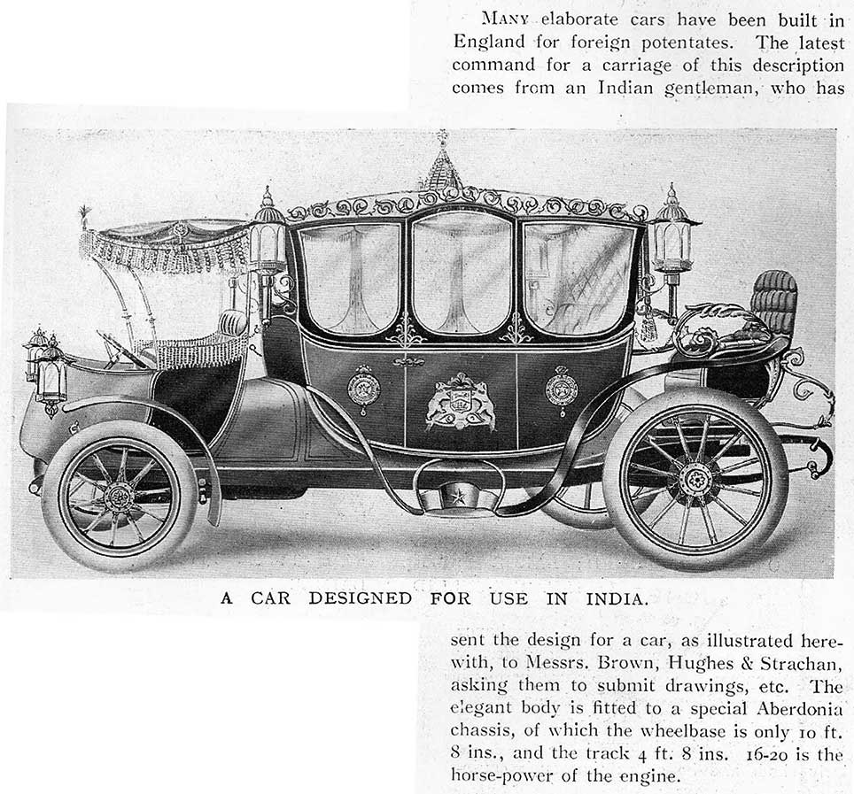 En indisk maharajah bad Brown, Hughes & Strachan om at designe et “galla-automobil”. Vognen var tænkt bygget på et Aberdonia chassis. Det er uvist, om køretøjet blev bygget. Bemærk fadingens lighed med “Irish State Coach”. Foto: forum-auto.caradisiac.com