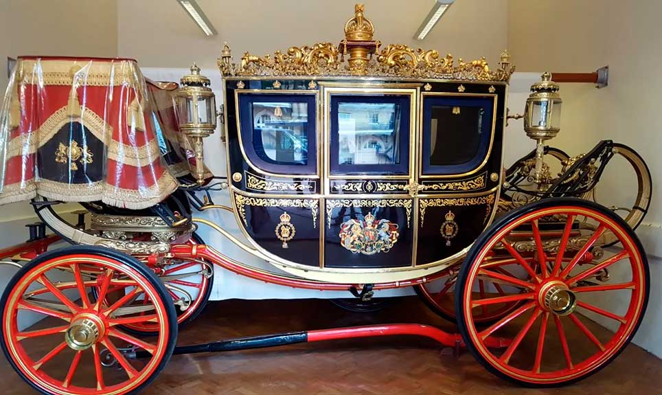 Den irske gallakaret, “Irish State Coach” i The royal Mews, London, blev bygget i 1851 af John Hutton & Sons of Dublin, der var kongelig hofvognbygger for Dronning Victoria. Foto: Wikipedia.